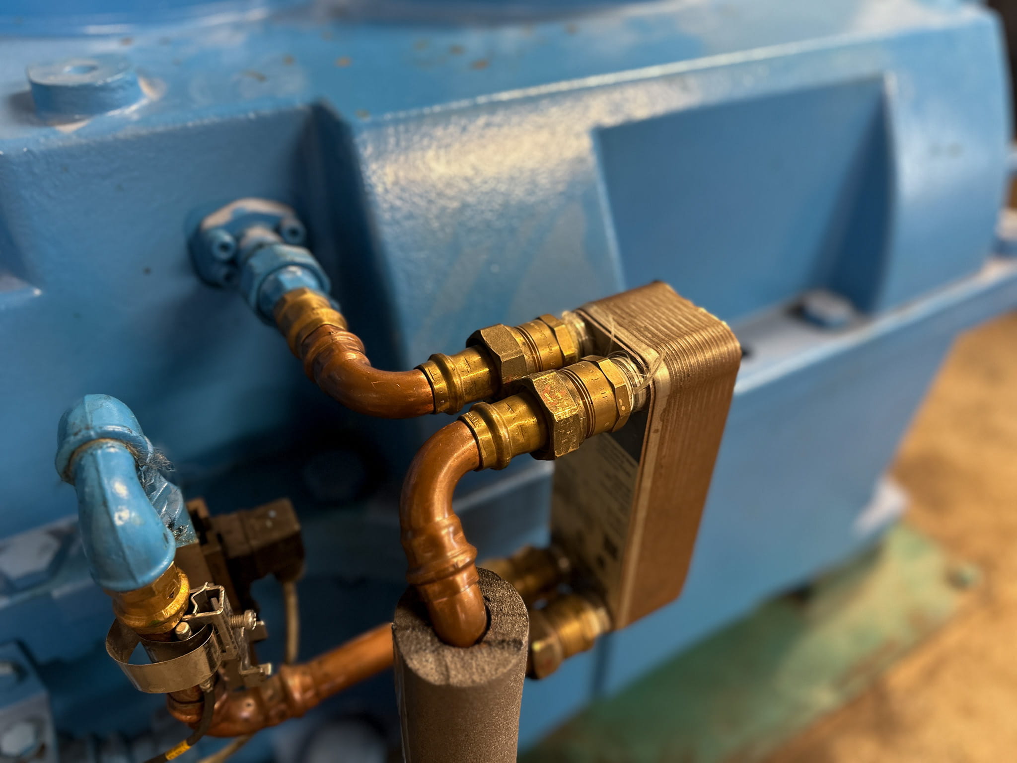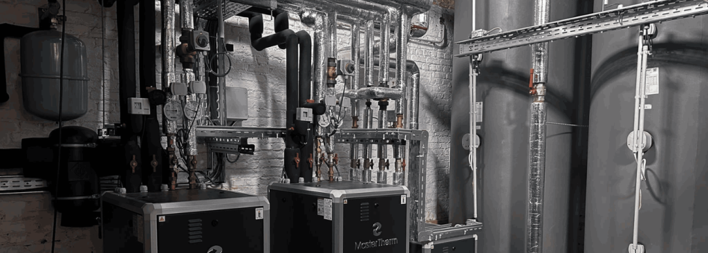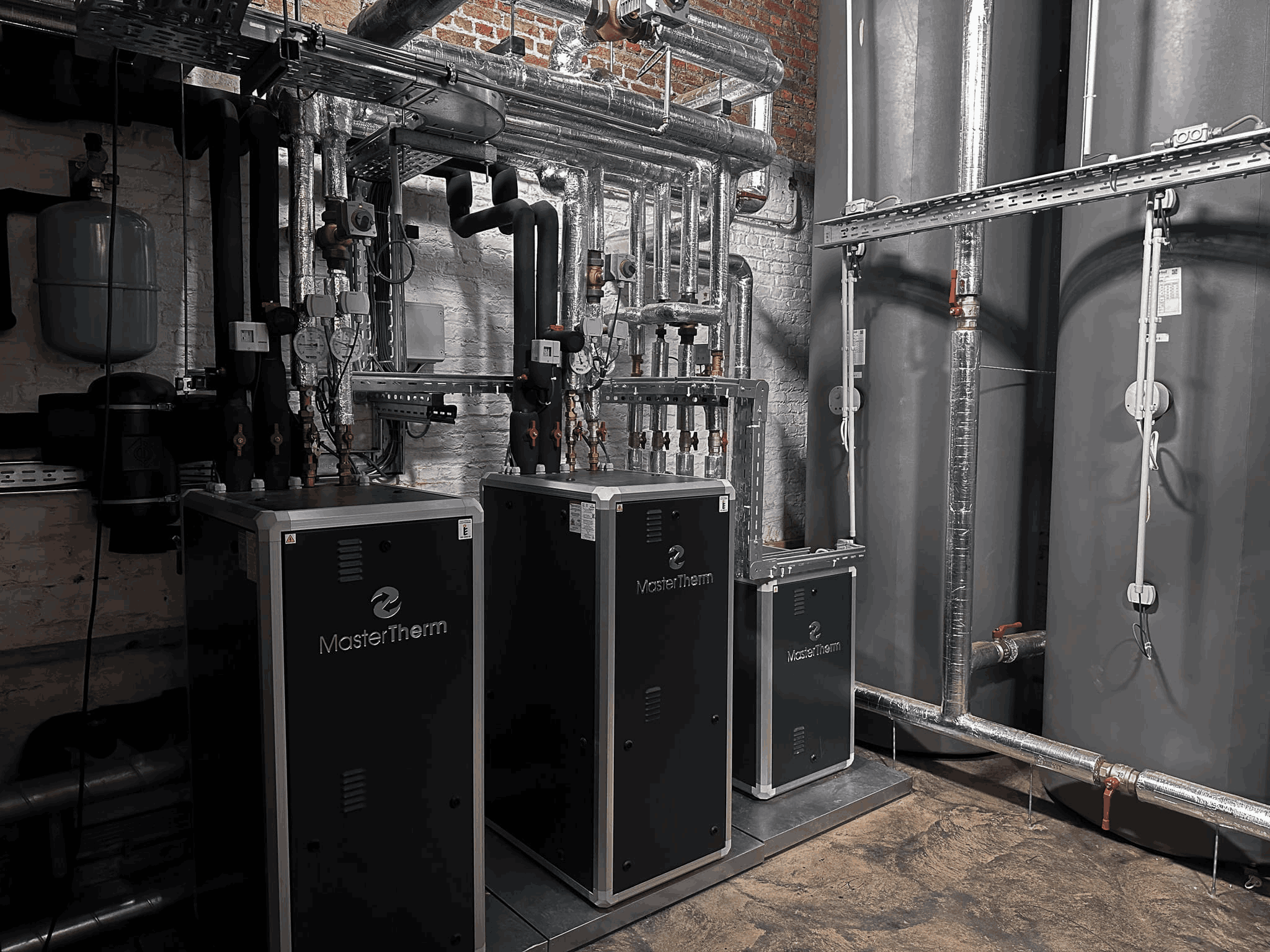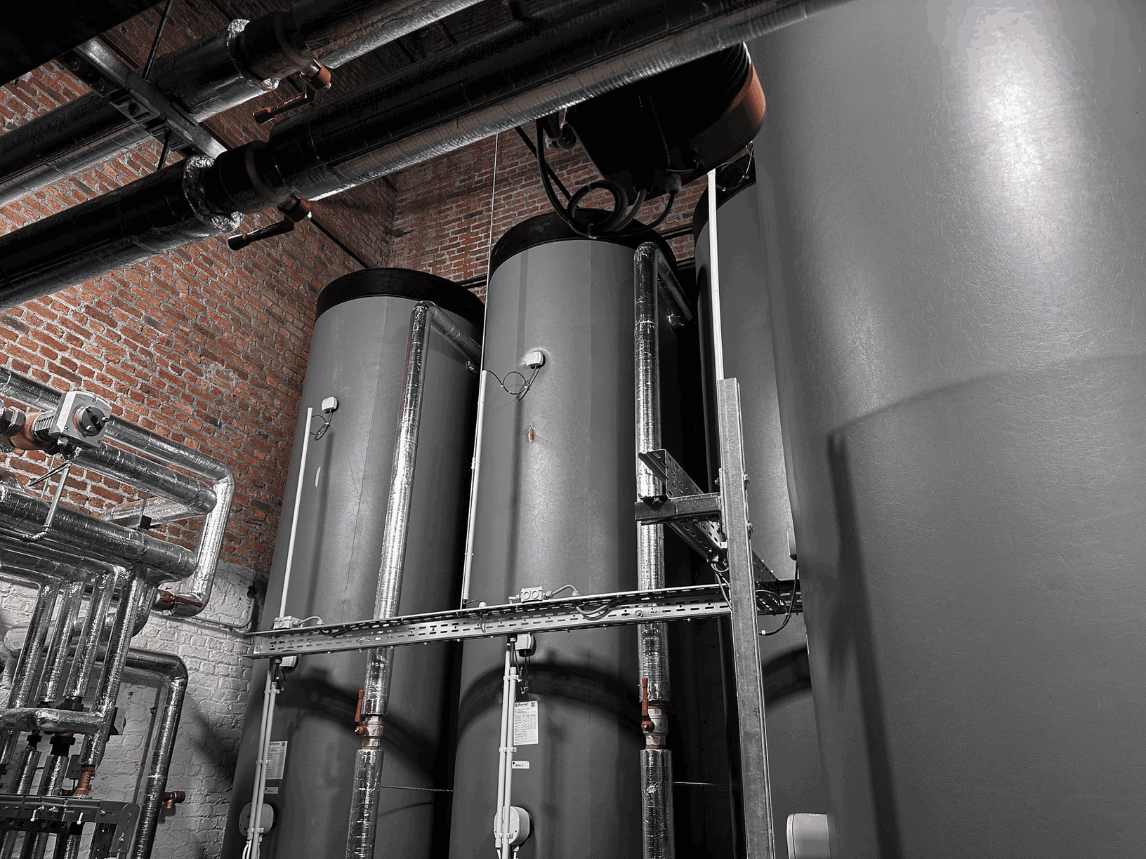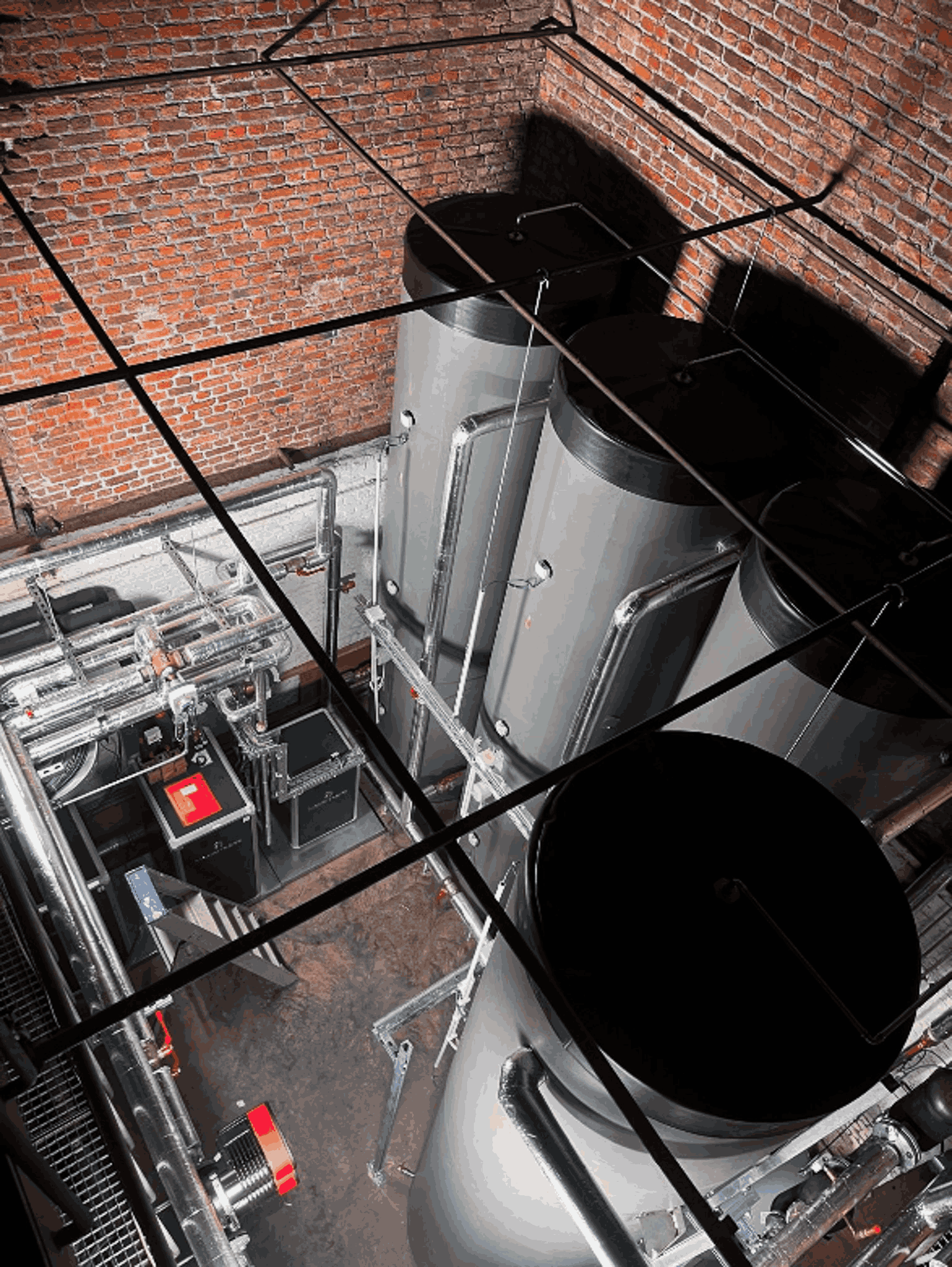 Een inox wisselaar in de Dijle wordt gebruikt om warmte te onttrekken en zo de cascade-opstelling te voeden. Deze opstelling bestaat uit twee propaan warmtepompen van Mastertherm die elk goed zijn voor 35kw vermogen. Daarnaast werd een bijkomende warmtepomp voorzien van 5kw, dit voor warmterecuperatie van de generator. Deze drie warmtepompen zorgen voor de bevoorrading van het door ons aangelegde warmtenetwerk, met voorgeïsoleerd leidingwerk van Terrendis. Om opslag te garanderen werden vier op maat gemaakte buffers geplaatst met elk een elektrische weerstand van 12 kW. Samen bieden zij een buffercapaciteit van maar liefst 8.000 liter.
